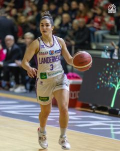 Sydney Wallace et Romane Bernies portant le maillot away bleu après une belle victoire en Euroligue – source photo FIBA